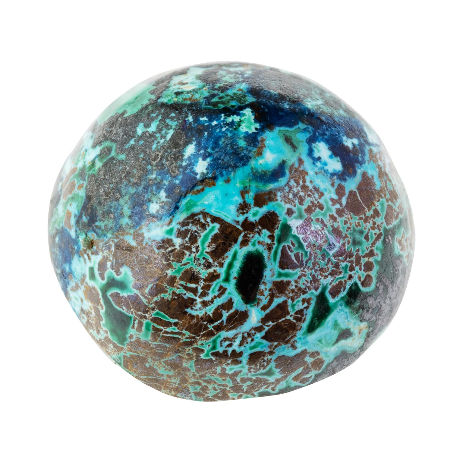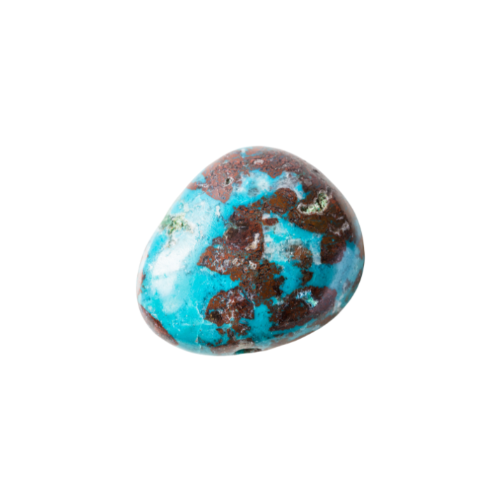 Théophraste la mentionne déjà au IVᵉ siècle avant J.-C., signe qu’elle fascinait autant par sa fonction que par ses couleurs. À l’état pur, la chrysocolle devrait tendre vers le bleu. Mais la nature la compose rarement seule : la présence fréquente de malachite, avec ses tonalités vertes, teint la pierre d’un bleu-vert si caractéristique et lui apporte souvent une tenue plus solide. C’est ainsi qu’elle se révèle : un minéral de rencontre, né de l’eau et du cuivre, où le bleu et le vert apprennent à cohabiter comme un paysage intérieur.