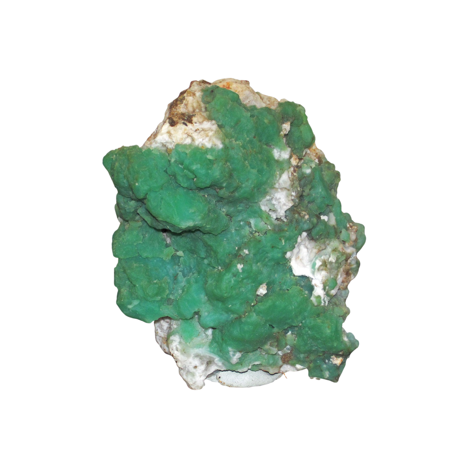 La chrysoprase appartient à cette famille discrète et dense qu’est la calcédoine : un quartz microcristallin, compact, serré, dont la beauté ne tient pas à de grands cristaux visibles, mais à une matière fine, presque veloutée. Sa teinte verte — parfois tendre, parfois plus profonde — ne vient pas d’un nouveau composé chimique, mais de la présence de nickel à l’état d’impuretés ou de micro-inclusions, comme une signature minérale déposée dans le quartz au cours de sa formation.